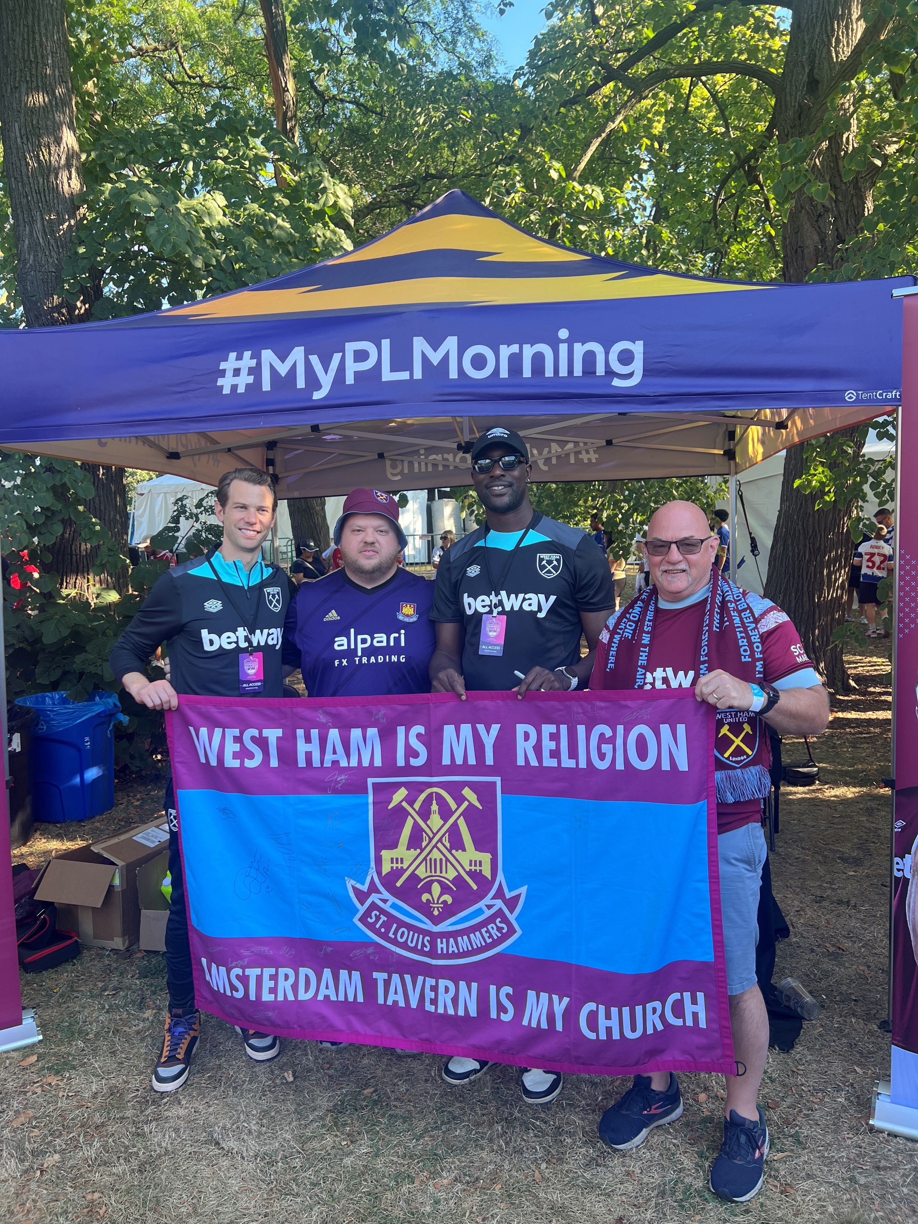 The St. Louis Hammers were formed in 2015! Russ Darbon and his son Brawley Darbon thought they were the only West Ham fans in the St. Louis region, that is until the St. Louis Hammers were founded on social media. It turned out there were several other fans in the area, so it was decided that the St. Louis Hammers would start watching together at the Amsterdam Tavern in St. Louis! The Amsterdam Tavern is open for every single Premier League game and there are usually anywhere from 5-30 fellow St. Louis Hammers at the Amsterdam to watch any given game. If you’re ever in the area, come by the Amsterdam and watch with us!
